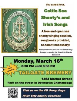 A monthly sea shanty singing session at the TailGate Brewery in downtown Chattanooga at 1464 Market Street, Chattanooga, TN 37408, on the second deck (floor)! Generally the third Monday of the month from 6:30 PM till 8:30 PM. Great food and grog (drinks) available. All ages welcome.